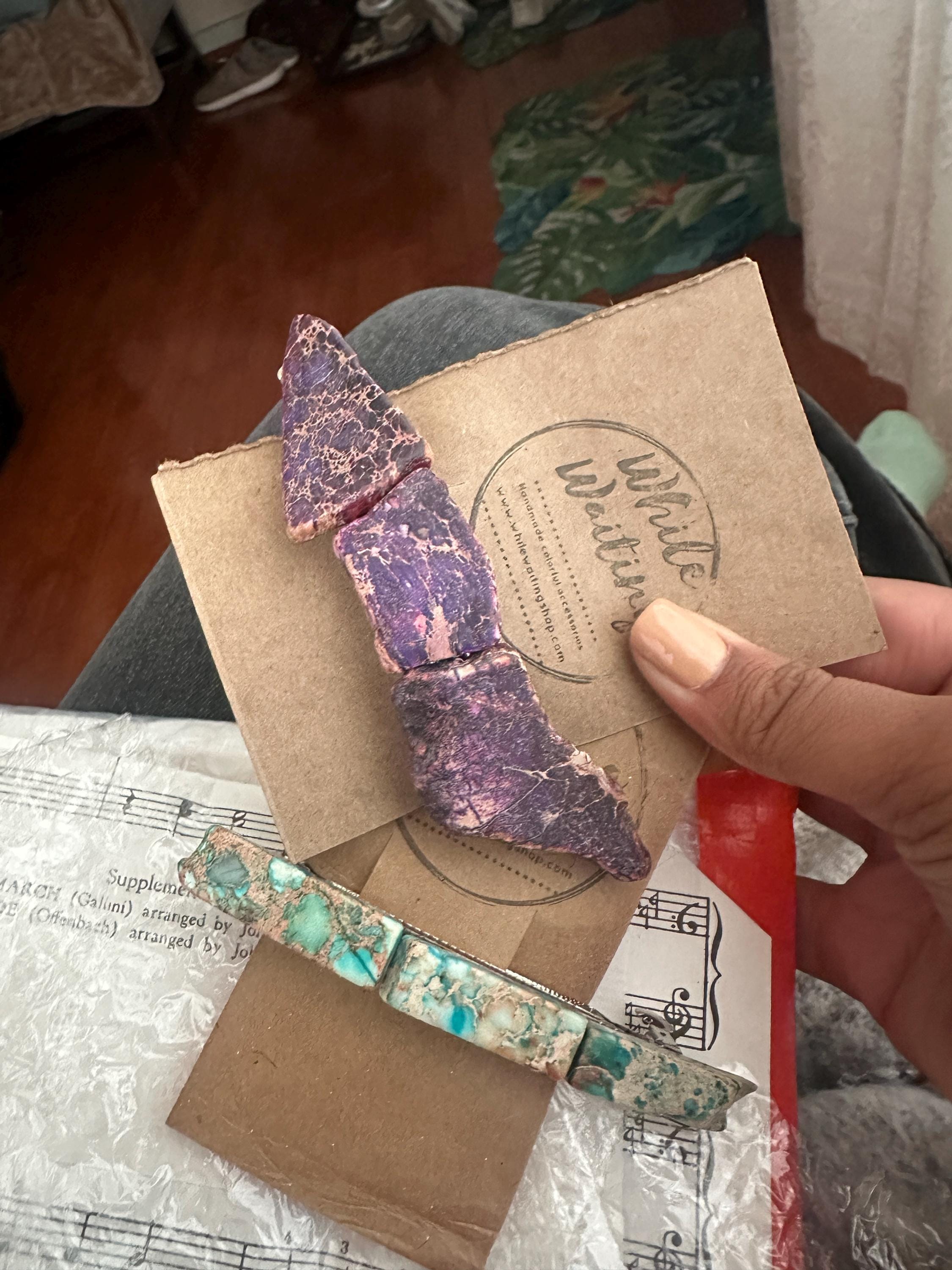 Most items can be wiped with a damp cloth if cleaning is necessary. Our paperbeads are varnished, but should not get wet. They are quite durable, but if a paperbead should become loose, touch it up with a little clear nail polish.