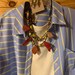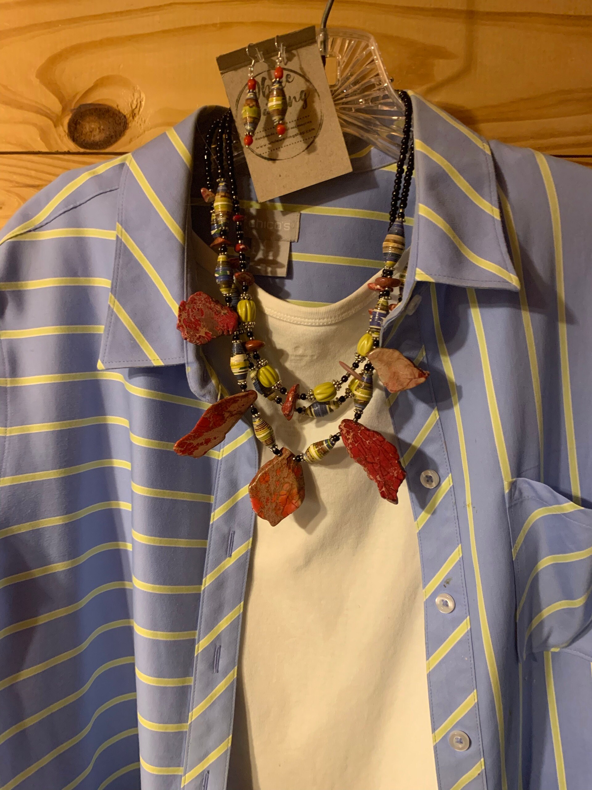 This richly colored statement necklace is full of personality. Rich red jasper stones are paired with handmade Haitian blue and green paper beads. These recycled cereal box beads are rolled and sealed, leaving hints of color that draw you in. Vintage yellow beads are also recycled from a previous life. The tiny black glass beads in the back make this a comfortable piece. There are 3 strands that are each designed uniquely to come together as a unified piece. A lovely silver tone clasp is just the right size to make this piece easy to to wear. 19 inches.